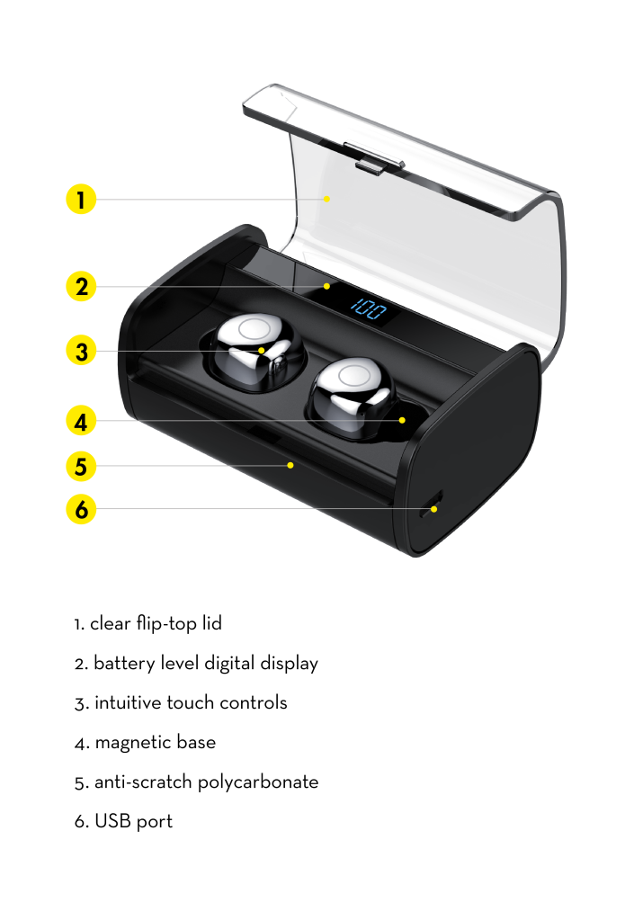 Recharge your battery on the go with the portable charging case, featuring a built-in battery which allows you to give 18 to 20 additional charges to your muve earbuds for up to 100 hours of music playtime. It can also be the backup battery as your smartphone, and can charge an iPhone X to 65%.