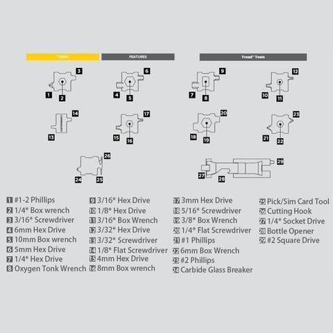 FIT MORE FUNCTIONALITY: A variety of box wrenches, hex drives, flat and Phillips screwdrivers, oxygen tank wrench, carbide glass breaker, sim card pick, cutting hook, socket drive adapter, and bottle opener.