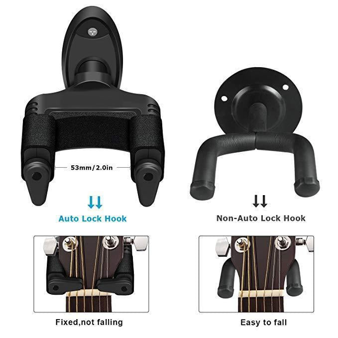 - GRAVITATIONAL SELF-LOCKING GUITAR HOOK: This instrument is a Gravity self-locking hook, it will automatically bring the arms up in front of the neck and prevents the guitar from falling, and releases the guitar when you lift it