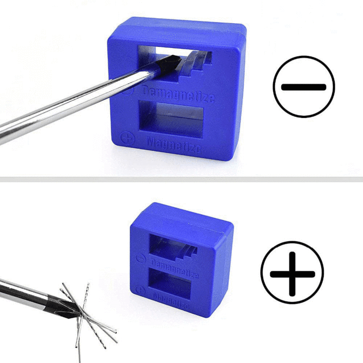 This pocket sized tool has powerful built-in C8 industrial permanent magnets which can INSTANTLY magnetize or demagnetize screwdrivers, tweezers & similar workshop tools simply by sliding along the (+) or (-) hole.