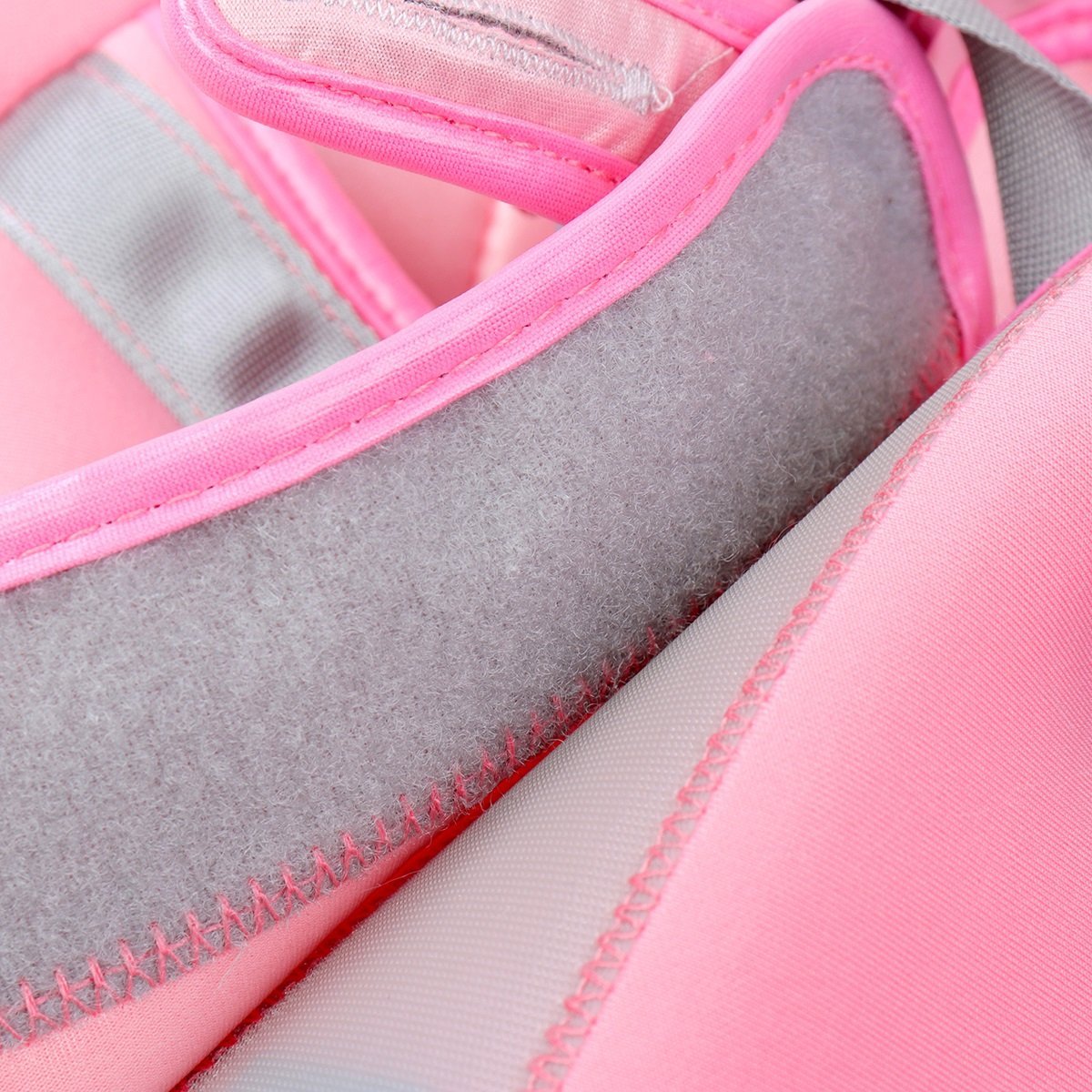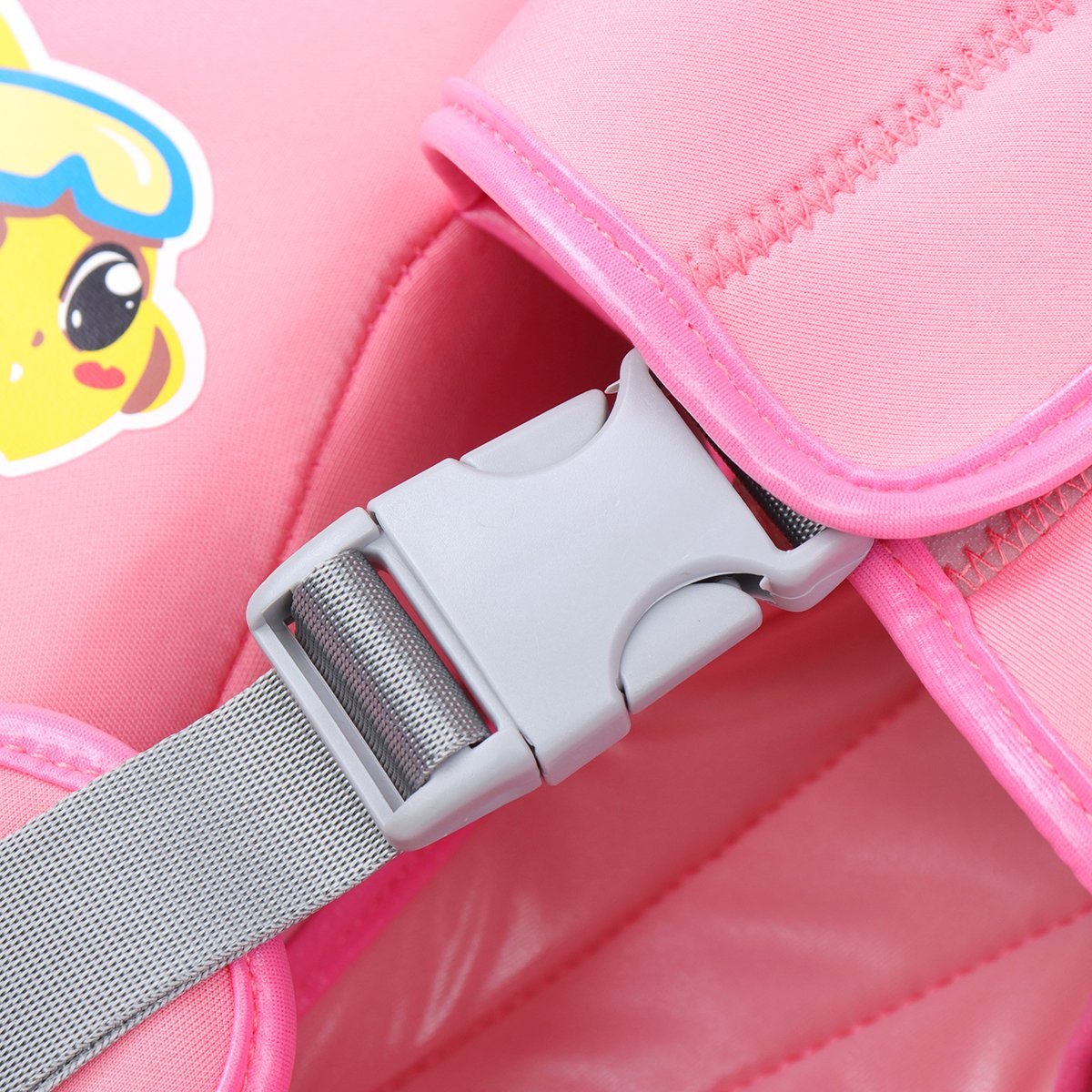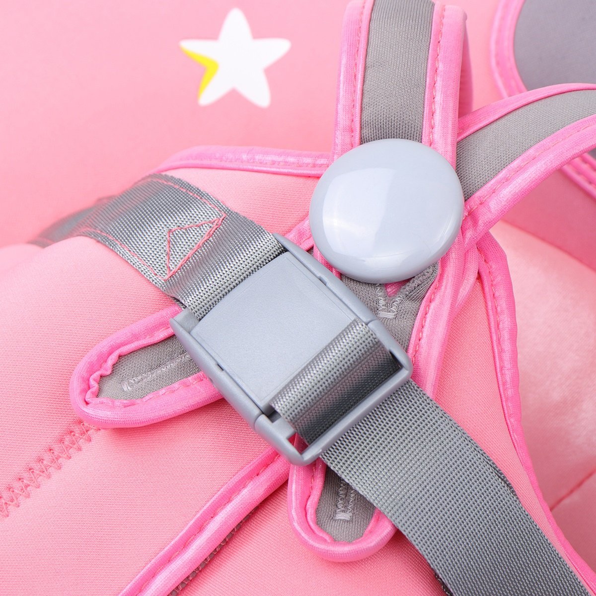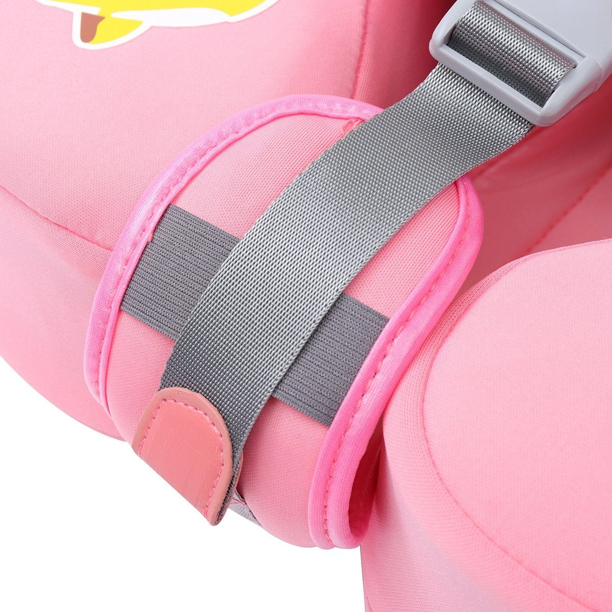 - Safety lock catch and harness vest so the baby doesn't slip when they are paddling. Two button hole and velcro to adjust. Double safety clasp, dual protection safety. Can use repeatedly and for long time. Built to for strong durability.