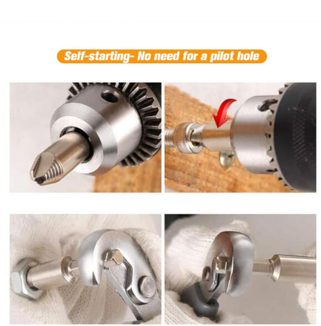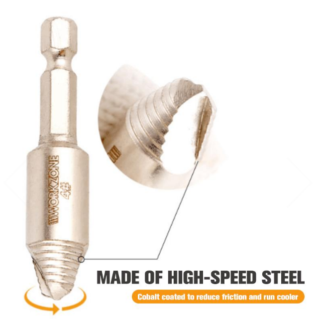 • The large bit has a 6-sided shank and small bits have hex shank to prevent slip in the drill chuck.